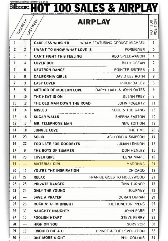 On February 23 1985, Material Girl made its debut on Billboard’s Airplay chart at #19, while on the Hot 100 the single jumped ahead ten positions from #34 to #24.