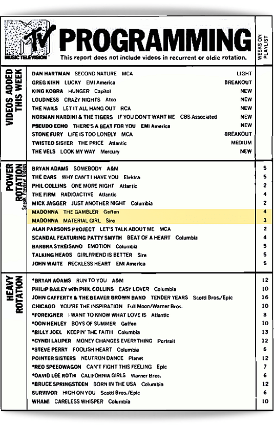 Meanwhile, television viewers were getting a double-dose of Madonna as both the Material Girl and Gambler music videos earned “Power Rotation” status on MTV’s weekly monitor.