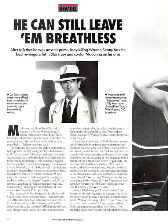 Today in Madonna History: July 2, 1990 July 2, 2021 By Jay in 1990, July Tags: Dick Tracy, I'm Breathless, On the Cover of a Magazine, People Magazine, Warren Beatty 3 Comments On July 2 1990, Madonna was featured on the cover of People Magazine with Warren Beatty to promote Dick Tracy. “Tell me you want me,” Breathless Mahoney implores to Dick Tracy in the wide-screen moonlight. “Tell me you want it all.” Share this: Click to share on Facebook (Opens in new window) Facebook Click to share on X (Opens in new window) X Click to share on Reddit (Opens in new window) Reddit Click to share on Pinterest (Opens in new window) Pinterest Click to share on WhatsApp (Opens in new window) WhatsApp Click to share on Tumblr (Opens in new window) Tumblr Click to email a link to a friend (Opens in new window) Email Like Loading... Related