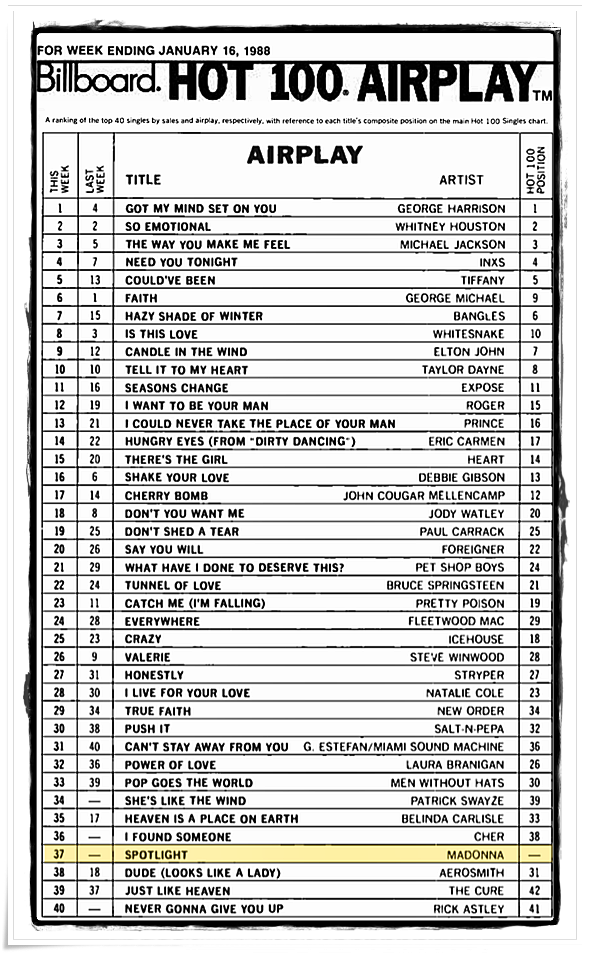 On January 16 1988, Spotlight entered Billboard’s Airplay chart at #37. The track would reach a peak of #32 three weeks later before falling to #40 in its final week.