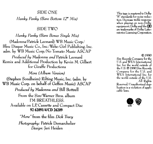 On August 25 1990, Hanky Panky peaked at #18 on the Canadian Top 100 Singles chart (RPM). At the time it was Madonna’s lowest charting Canadian single since Borderline‘s peak of #25 in September, 1984. A handful of later releases would subsequently peak lower on the same chart, however, including Bad Girl (#20 – 1993), Bedtime Story (#46 – 1995) and Human Nature (#64 – 1995).