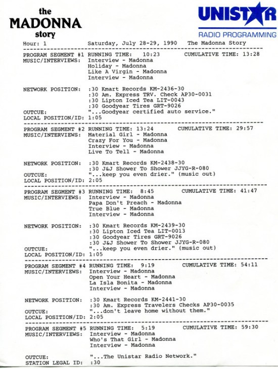 On July 28 1990, Unistar Radio Programming aired The Madonna Story radio special in the USA. The hour and a half special included a mix of Madonna’s hit songs and a selection of interviews. The special was aired again the next day.
