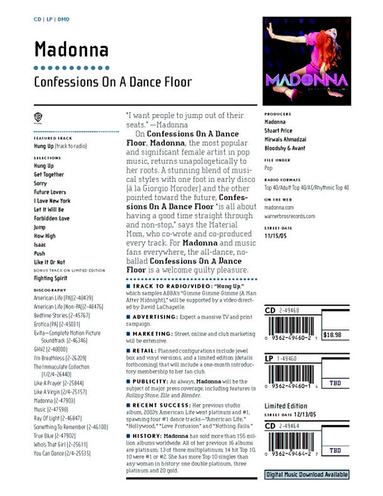 On November 15 2005, Madonna’s tenth studio album, Confessions On A Dance Floor, was released in North America by Warner Bros Records. The majority of the album was co-produced and co-written by Madonna & Stuart Price, with additional contributions by Mirwais, Bloodshy & Avant, Joe Henry and Anders Bagge & Peer Åström. It featured the singles Hung Up, Sorry, Get Together and Jump.