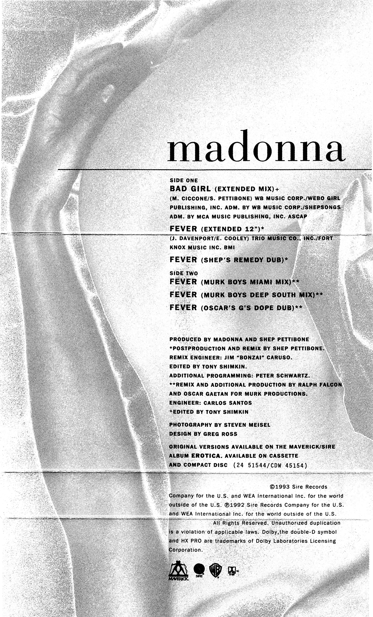 The Bad Girl single was backed with the album version of Fever in North America (both songs were released separately in Europe), while the Bad Girl maxi-single focused primarily on remixes of Fever along with an extended version of Bad Girl. Strangely, a music video for Fever was produced only after the single had run its course on the European charts, set to a remix that was not issued was not included on the North American maxi-single of Bad Girl or the Fever 12-inch promo set that was serviced to DJ’s in the U.S.