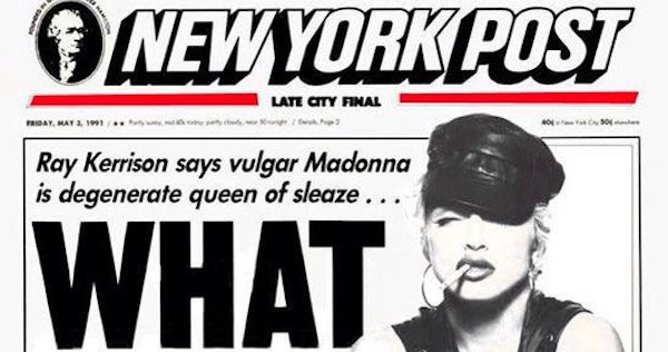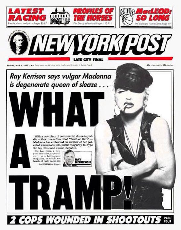 On May 3 1991, Madonna appeared on the cover of The New York Post with the headline, “What A Tramp!” The article focused on Madonna’s Truth Or Dare documentary. In the article, Ray Kerrison called Madonna, “vulgar” and the “degenerate queen of sleaze.”