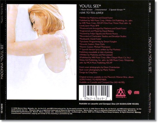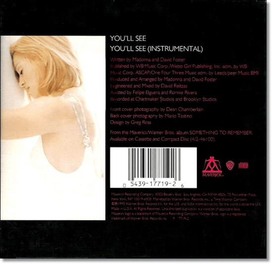 There are several potential reasons that could explain the low sales of its maxi-single. Ballads, unless heavily and successfully remixed, naturally generated less interest with this format, which was primarily geared towards attracting dance music listeners. Many of Madonna’s ballads were not released in the format for this reason. You’ll See was not given an officially released remix treatment but instead featured a Spanish-sung version of the song, an instrumental version, and a live version of another previous ballad hit, Live To Tell.