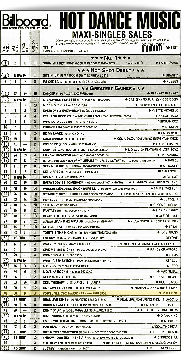 On February 17 1996, the maxi-single for You’ll See spent its final week on the Maxi-Single Sales chart in Billboard magazine at #40.