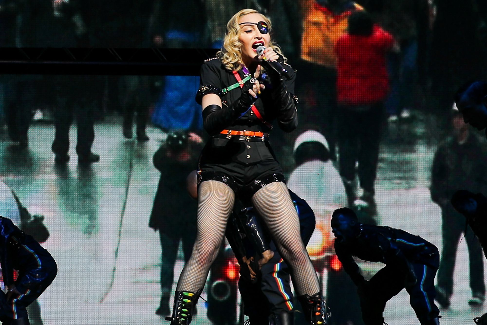 And there were more. Film-noir detectives pursued and interrogated Madonna in another disco-tinged song, I Don’t Search I Find; Crave, which warns, “My cravings get dangerous,” flaunted a full-sized disco ball. A pair of robotic but sinuous dancers, with red lights for eyes, flanked Madonna as she sat at a piano for the ominous Future, while the video screen filled with images of urban and environmental destruction. She surrounded herself with a choir of brightly robed women and geometric Arabic designs in Come Alive, which used the metal castanets and triplet rhythm of Moroccan gnawa music to back her as, once again, Madonna’s lyrics rejected unwanted opinions and restrictions.