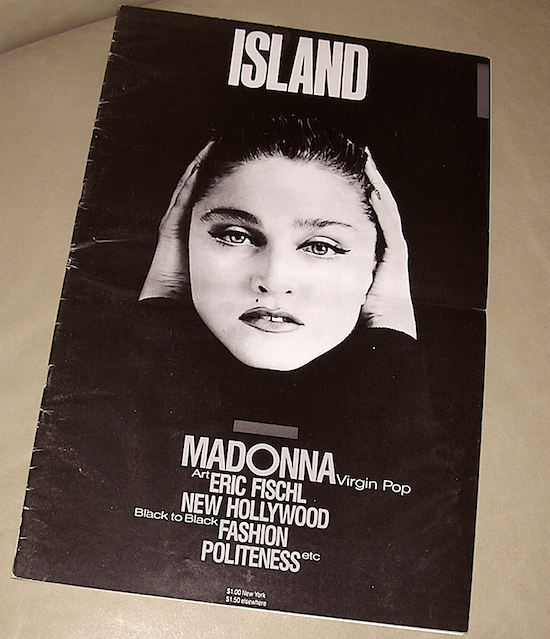 On October 1 1983, Madonna appeared on her first magazine cover for Island magazine, shot by Curtis Knapp. The black & white cover image stands out from the many other Madonna photographs of the era due to its minimalist feel, focusing solely on Madonna’s facial features.