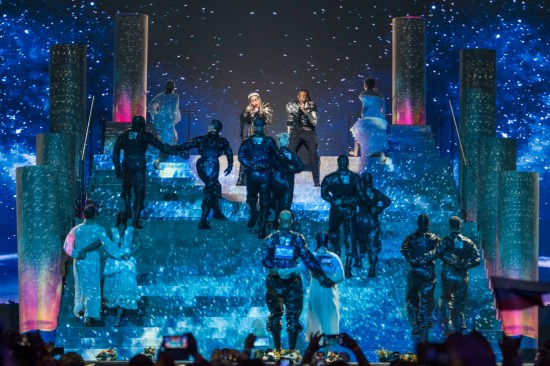 On May 19 2019, Madonna was scolded in the international press for “making a political statement” during her performance at the Eurovision Song Contest held the previous day, which ended with performers wearing Israeli and Palestinian flags on their backs with arms interlocked in embrace and the words “wake up” appearing on a stage screens.