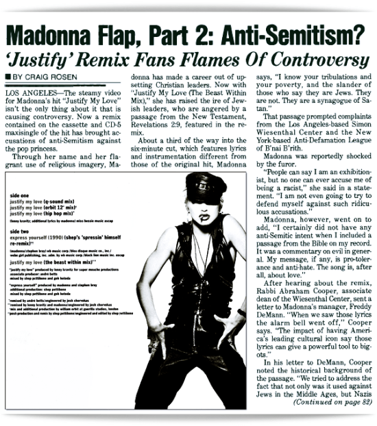 On January 19 1991, Billboard magazine reported on the controversy surrounding Madonna’s use of prose from the Book of Revelations in a remix featured on the maxi-single of Justify My Love, titled The Beast Within. The remix was created by Madonna & Lenny Kravitz during the recording session for Justify My Love.