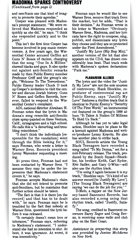 The article also mentions the song’s use of Public Enemy’s Security Of The First World as the basis of Justify My Love‘s rhythm track, with Public Enemy’s co-producer revealing an intent to sue Madonna & Kravitz over its use. Madonna had only received credit for “additional lyrics” on the song, while Kravitz was originally credited as composer and producer.