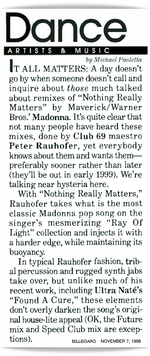 It’s difficult to fully frown on Warner Bros.’s seemingly uncontainable enthusiasm for the brilliant remixes of Ray Of Light‘s fourth single, Nothing Really Matters, despite the highly unconventional timing of servicing them to clubs six months ahead of their commercial release.