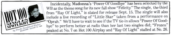 A decision by Warner Bros. to withhold a maxi-single release for The Power Of Good-Bye in the U.S., compounded by the lack of any non-album content on the standard single despite earlier reports, suggests that the changes to the Hot 100 may have created a larger ripple than Warner had anticipated. Including the Oprah performance of Little Star, as previously reported in Billboard, or even the Dallas Austin remix of The Power Of Good-Bye on the b-side certainly would have given fans more incentive to pick up the 2-track single in the U.S.