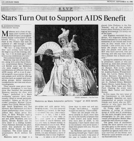 On September 7 1990, Madonna was honored with the Commitment To Life Award and performed Vogue at the Commitment To Life IV benefit for AIDS Project Los Angeles (APLA) at the Wiltern Theatre in Los Angeles, California.