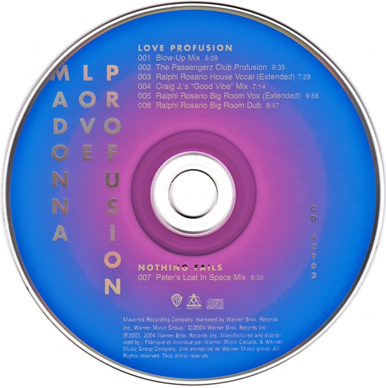 On March 16 2004, Love Profusion was commercially released in North America on CD maxi-single. In the U.S., a double 12″ vinyl edition of the maxi-single was also released one week later, on March 23rd. Written & produced by Madonna & Mirwais Ahmadzaï, Love Profusion was the fourth and final North American single release from the American Life album. In the UK, Warner chose to issue the song instead of Nothing Fails as the album’s third and final single in December, 2003.