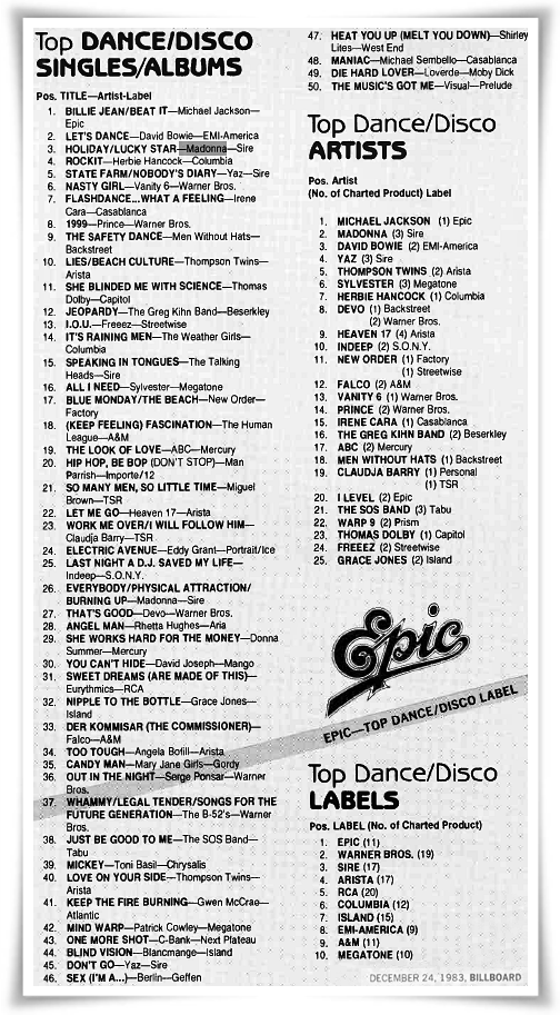 On December 24 1983, Madonna was named runner-up for Top Dance/Disco Artist Of The Year in Billboard magazine’s year-end issue, while Michael Jackson took top honors.