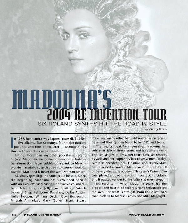On November 14 2004, Madonna was featured on the cover of Roland Users Group magazine, with the headline, “Six Roland Synths Hit the Road in Style.” The article discusses some of the talented keyboardists (Marcus Brown and Mike McKnight) who toured with Madonna during her Re-Invention World Tour, and how the music was put together for the show.
