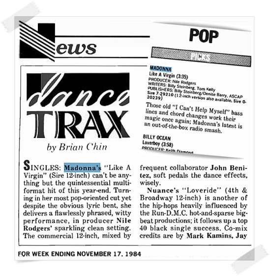 On November 17 1984, the title-track and lead single from Madonna’s Like A Virgin album entered the Billboard Hot 100 at #48 – the week’s highest debut – hot on the heels of its commercial release as a 7-inch single in the preceding sales week. A commercial 12-inch single was also issued in North America during the chart week ending November 17th, with Like A Virgin pouncing onto the Hot Dance/Disco Sales chart at #26 in the November 24th issue of Billboard.