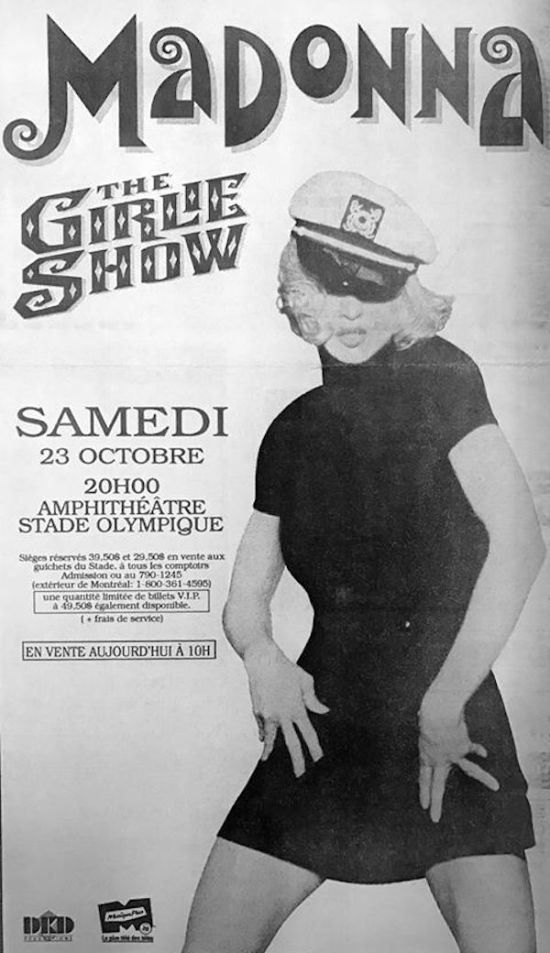On September 14 1993, the official tour flyer for The Girlie Show World Tour was published in newspapers across the province of Quebec, advertising the upcoming Madonna concert to be held at the Olympic Stadium in Montreal on October 23. Ticket prices ranged from $29.50 to $39.50 with a very limited number of tickets for $49.50. In total, 52,000 tickets were made available for the show and the concert sold-out!