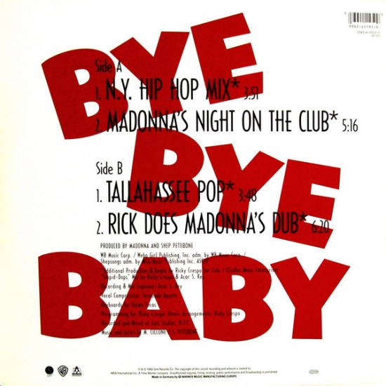 Bye Bye Baby was written by Madonna, Shep Pettibone and Anthony Shimkin and was produced by Madonna and Shep.