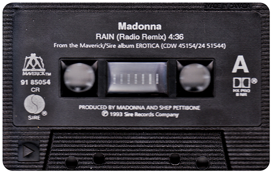 Following a cold reception to Madonna’s previous North American single – the bleak-but-beautiful Bad Girl – Rain was given a glossy makeover by French record producer Daniel Abraham (who had recently completed a similar assignment with the video remix of Fever) to help ensure that it would receive a warmer welcome from radio programmers. The U.S. promotional CD that was serviced to radio by Maverick/Warner offered the choice between the sweetened “Radio Remix” (in full-length and edited form) or an edited album version, the latter of which was fittingly used in the song’s gorgeous music video.